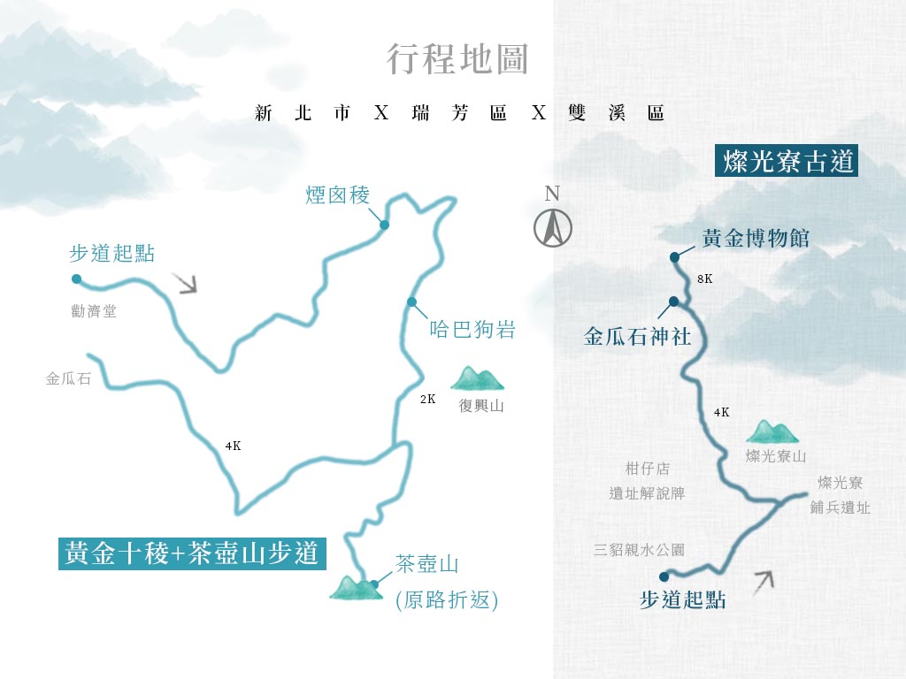 D1: 8:00台北車站西三門出發-09:45燦光寮古道登山口-11:00古道岔口-11:40燦光寮鋪-13:00柑仔店遺址-14:00草山戰備道-15:30緩慢‧金瓜石 民宿(下午茶、晚餐)