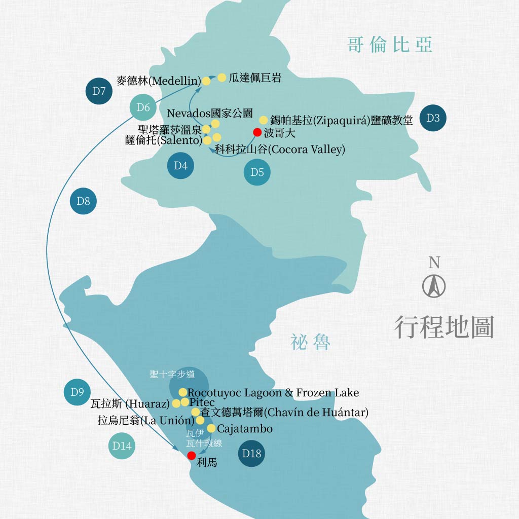 | | 令人不捨離去的精彩健行終有結束的日子。今日為交通天,早上從溫泉區出發,傍晚抵達利馬市區,入住5星級酒店。晚上享受慶功宴,把酒言歡,細細回憶漫步安地斯山區的點點滴滴,已成為生命中的重要足跡。 | | 餐食:早餐/營地早餐 午餐/當地簡餐 晚餐/西式料理慶功宴 | | 旅館:Hyatt Centric San Isidro Lima (5星) |