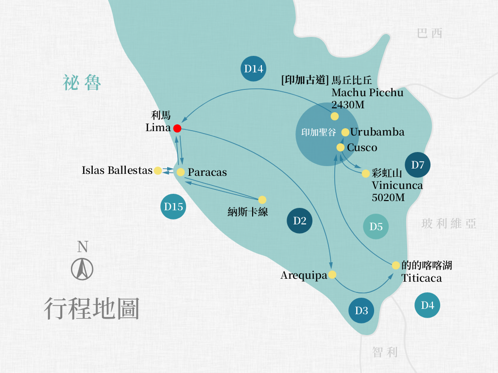 ■ 豐富的旅遊體驗 – 的的喀喀湖 & 庫斯科安排 3天健行,包括著名景點-彩虹山;健行結束之後前往太平洋岸,觀察海鳥生態,並搭乘小飛機欣賞神秘的納斯卡線 (團費包含小飛機費用)。