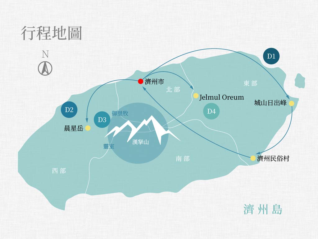本行程將於紅葉季節時健行漢拏山區,並順爬數個特色迥異的火山,此外將走入知名的「偶來小徑」,不僅看到海岸自然風光、看到人文景色,也學到了關於濟州島過去的歷史,是一趟腳底踏實、心裡豐富的旅程。